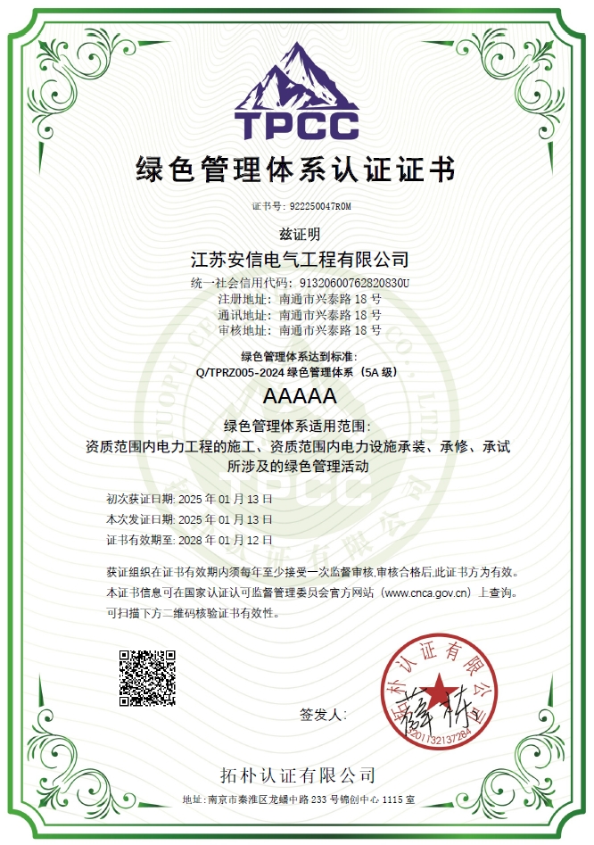 在創(chuàng)業(yè)之初,公司就堅(jiān)持高起點(diǎn)的戰(zhàn)略思路,廣納賢才,集聚行業(yè)精英,創(chuàng)新發(fā)展,做優(yōu)企業(yè)品牌。現(xiàn)已取得:承裝二級(jí)、承修二級(jí)、承試二級(jí),電力工程施工總承包二級(jí),輸變電工程專業(yè)承包二級(jí),建筑工程施工總承包二級(jí),建筑機(jī)電安裝專業(yè)承包二級(jí),地基基礎(chǔ)專業(yè)承包二級(jí)資質(zhì)證書(shū),并通過(guò)了質(zhì)量、環(huán)境、職業(yè)健康和安全管理體系認(rèn)證,確保各項(xiàng)工作有序管控。